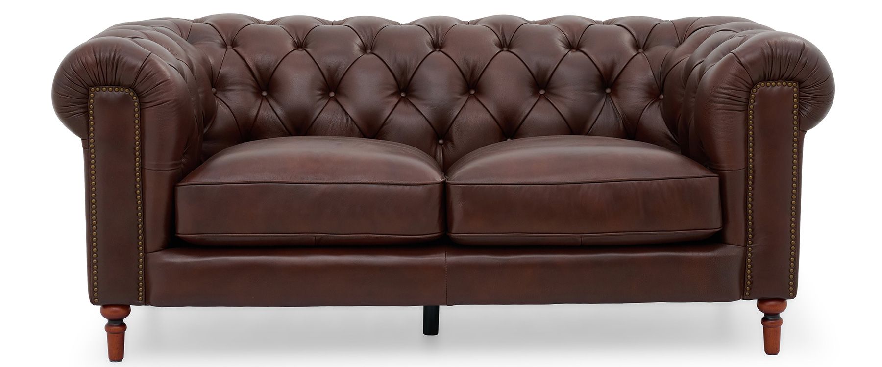Colors Chestnut Brown Leather and natural Fabric Material 100% premium Chestnut brown leather Cushioning Supportive high density foam seat cushions with premium spring cushioning Feet Dark stained oak feet with elegant turning for a refined, traditional finish Frame Hardwood and softwood frame construction with expert spring webbing Features Classic Chesterfield design with tufted button detailing