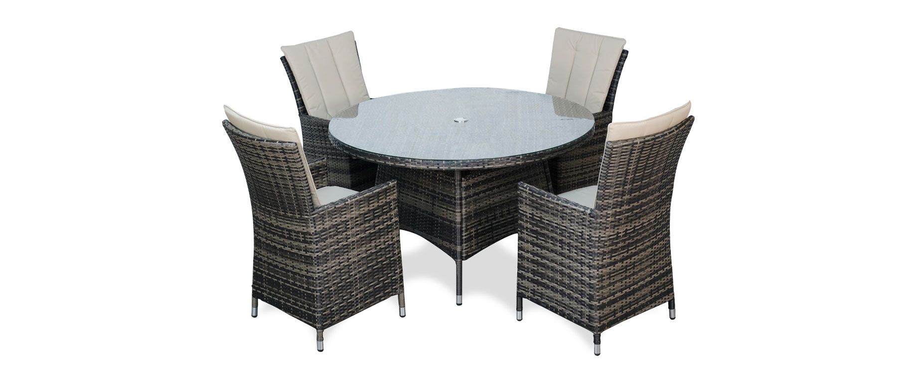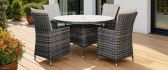 Please write a reviewHow did you feel about your recent purchase? We'd love to hear your thoughts and share them with others!Transform your outdoor space with the Elara Round 4 Seat Brown Rattan Garden Set, a perfect blend of elegance, comfort, and durability. Designed for smaller patios, balconies, and gardens, this compact yet stylish set features a round dining table and four cushioned rattan chairs, providing a cozy and inviting outdoor dining experience. The deeply cushioned chairs offer excellent support, making alfresco dining a pleasure. Whether you're enjoying morning coffee, casual lunches, or intimate evening meals, the Elara Round 4 Seat Brown Rattan Garden Set adds a touch of modern elegance to any outdoor setting.Product Information