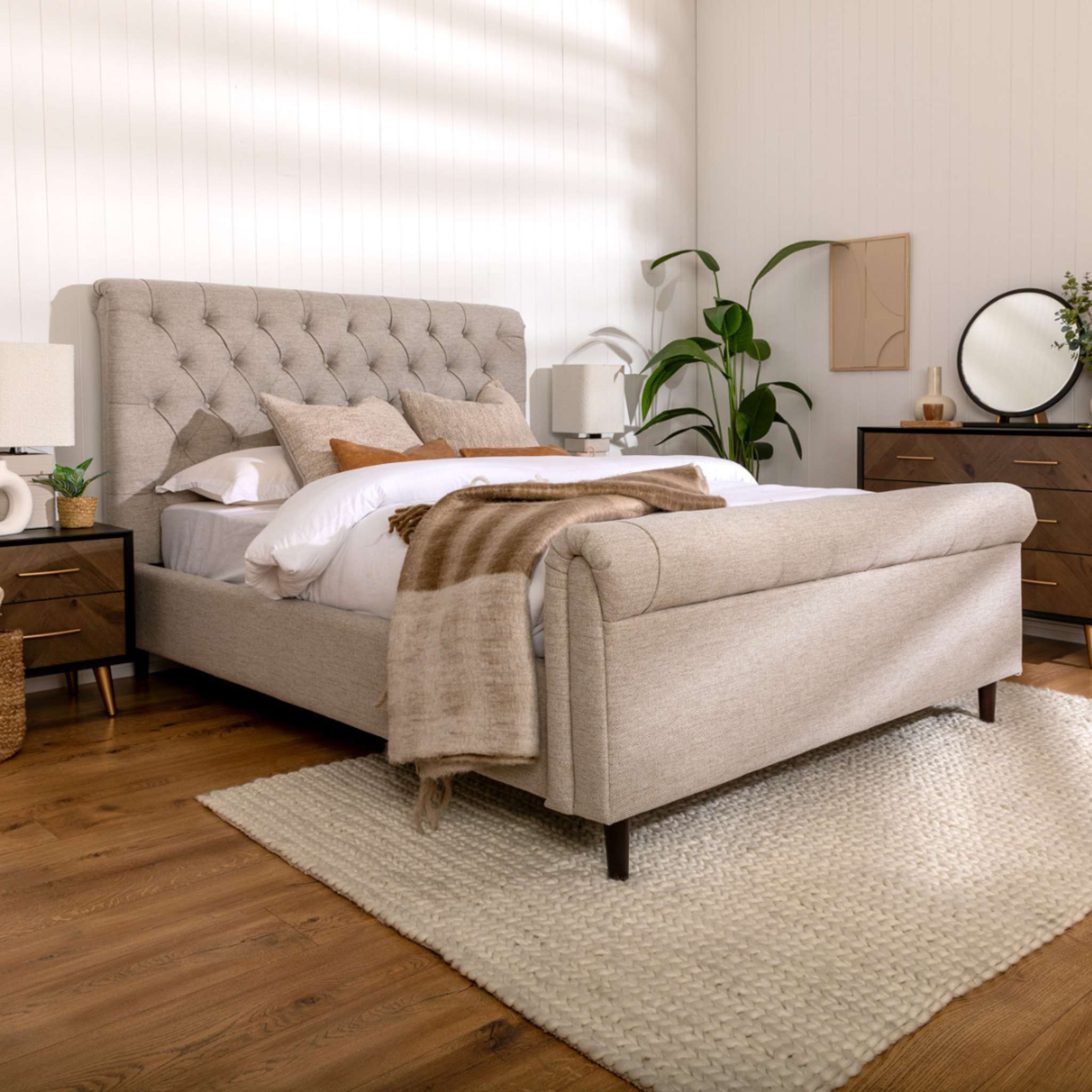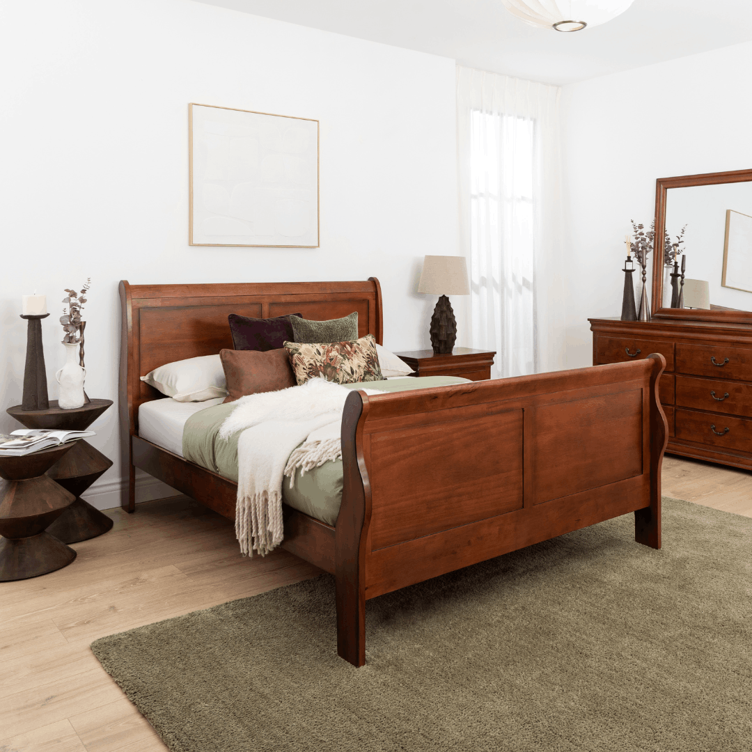 - Sleigh Beds – Curved headboards and footboards inspired by classic 19th-century designs
