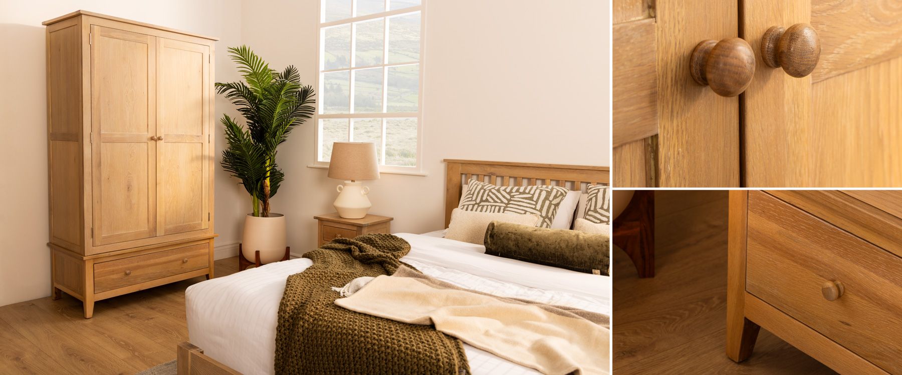The Russell Oak Double Wardrobe offers classic styling and practical storage for your bedroom. Constructed from sturdy materials with a warm oak finish, this wardrobe features double doors that open to reveal a full-length hanging rail—perfect for coats, dresses, and everyday clothing. Timeless in design, with subtle details and a natural wood grain look, it complements both traditional and transitional interiors. The Russell wardrobe is a functional and elegant storage piece for any home.