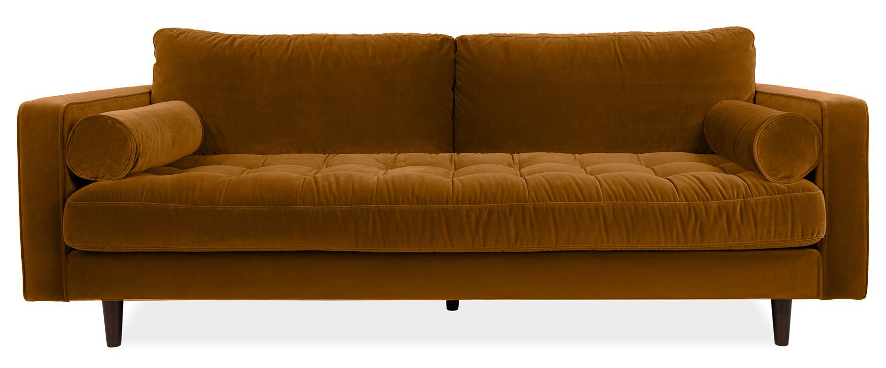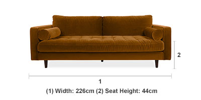 Please write a reviewHow did you feel about your recent purchase? We'd love to hear your thoughts and share them with others!The Scott Cognac Velvet 3 Seater Sofa is a spacious and inviting centrepiece for contemporary living rooms. Upholstered in luxurious cognac velvet, with an 85% cotton and 15% polyester composition, it offers a soft, durable finish that enhances its sleek design. Built with a strong hardwood and softwood frame, the sofa is supported by solid wood legs in a dark stained finish for strength and elegance. Its deep cushioned seats are filled with high-density foam cores wrapped in fibre, ensuring plush comfort while maintaining shape. Two matching bolster cushions are included, enhancing both design and relaxation. The 3 seater design provides ample seating space while pairing effortlessly with other Scott pieces such as the armchairs, chaise, and footstools. With its bold velvet finish and modern profile, this sofa makes a striking addition to any interior.Product Information