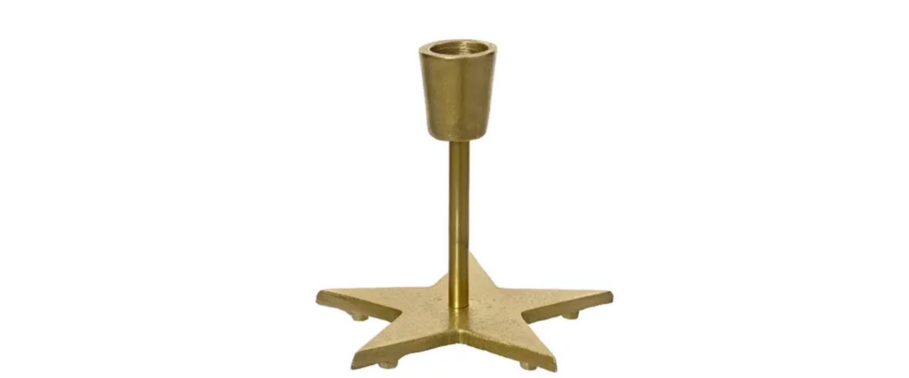 Please write a reviewHow did you feel about your recent purchase? We'd love to hear your thoughts and share them with others!Illuminate your space with timeless elegance using this Star-Shaped Base Candle Holder, crafted from high-quality aluminium and finished in a radiant gold tone. The precision-cast aluminium construction ensures strength and durability, while the metallic finish provides a warm, lustrous glow that complements both modern and traditional interiors. The five-point star base offers a distinctive silhouette, designed not only as a stable foundation for taper candles but also as a decorative statement piece in its own right. Its reflective gold surface enhances ambient lighting, creating a sophisticated atmosphere for festive occasions, dinner settings, or everyday décor. Only availble to purchase in store.Product Information